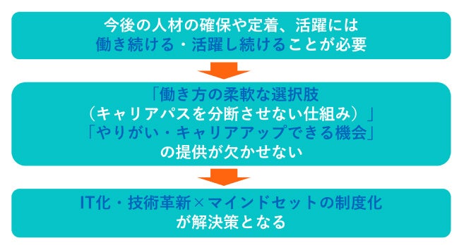 4つの領域の先進的な取り組み事例から、今後の人材の確保、定着、活躍促進のためには、「働き続けること」と「活躍し続けること」の環境づくりが必要。そのためには「働き方の柔軟な選択肢」と「やりがい・キャリアアップできる機会」の提供が不可欠であることが見えてきました。また、サービス業事業者が従業員にこの2つを提供するためには「IT化・技術革新」×「マインドセットの制度化」の推進が重要であることも見えてきました。「働き続ける」、「活躍し続ける」ことのできる職場環境が整備されることで、ES(従業員満足度)が高まり、従業員のパフォーマンスや提供サービスが向上することで、CS(顧客満足度)の高まり、そして業績向上につながるサイクルが生まれると考えられます。