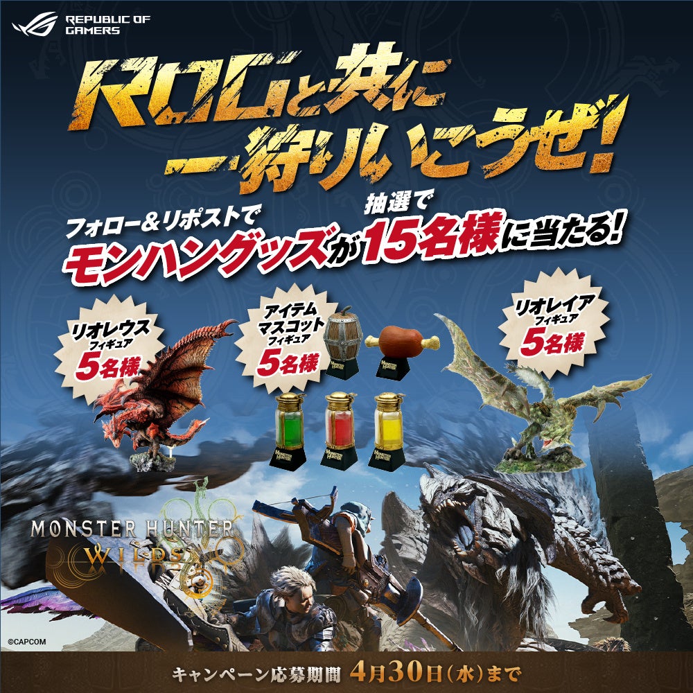 ASUS JAPAN株式会社は、ROGと共に一狩りいこうぜ!モンハンワイルズのグッズが当たるSNSキャンペーンの開催を発表しました。ROGの公式Xをフォローしてキャンペーン投稿をリポストするとモンスターハンターワイルズのグッズが抽選で15名様に当たります。