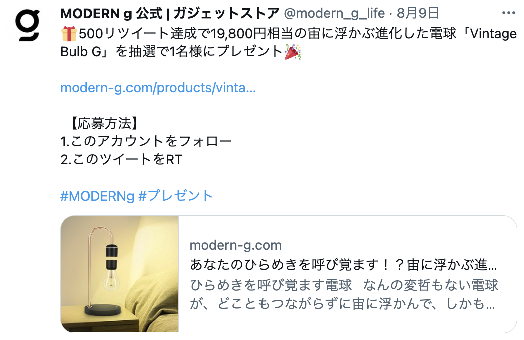 【19,800円相当の宙に浮かぶ進化した電球「Vintage Bulb G」抽選で1名様にプレゼント】MODERN gの公式Twitterで毎日ギブアウェイキャンペーン中!