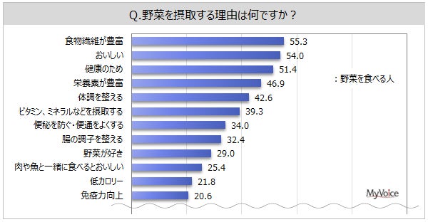 野菜を食べる人の理由は(複数回答)、「食物繊維が豊富」「おいしい」「健康のため」が各50%台、「栄養素が豊富」「体調を整える」が各40%台です。