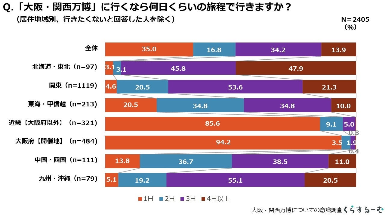 万博以外の前後の旅程も含めて何日くらいで行ってみたいかを尋ねたところ、大半が3日以内の旅程でした。開催地の近畿圏では日帰りが大半を占めますが、出発地が近畿圏から離れるに従い日数も増える傾向にあります。