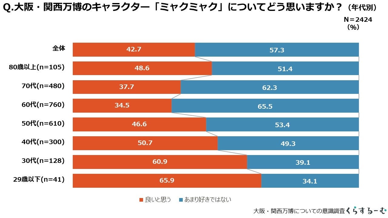 大阪・関西万博の公式キャラクター「ミャクミャク」をどう思うか尋ねたところ、おおむね年代が若い方が「良いと思う」割合が高い傾向がありました。40代までは「良いと思う」割合が過半数となっています。「あまり好きではない」割合が多いのは60代が最も多く、それ以上の年代では「良いと思う」割合が盛り返していますが半数を超えていませんでした。