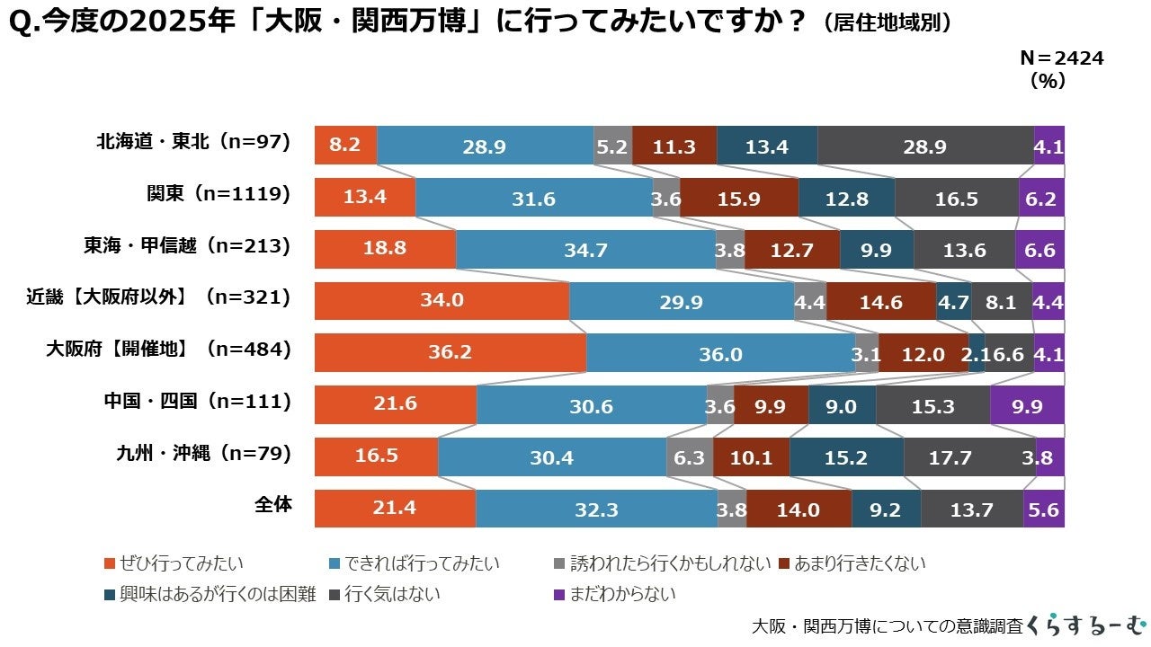 居住地域別にみると、開催地である大阪府では7割以上、大阪府を除く近畿では6割以上が「行ってみたい」と答えています。また東海・甲信越、中国・四国でも「行ってみたい」方が過半数となっています。一方で、北海道・東北、関東、九州・沖縄では「行ってみたい」方は半数以下で、大阪から遠いほど「興味はあるが行くのは困難」「行く気はない」という回答割合が高くなっています。