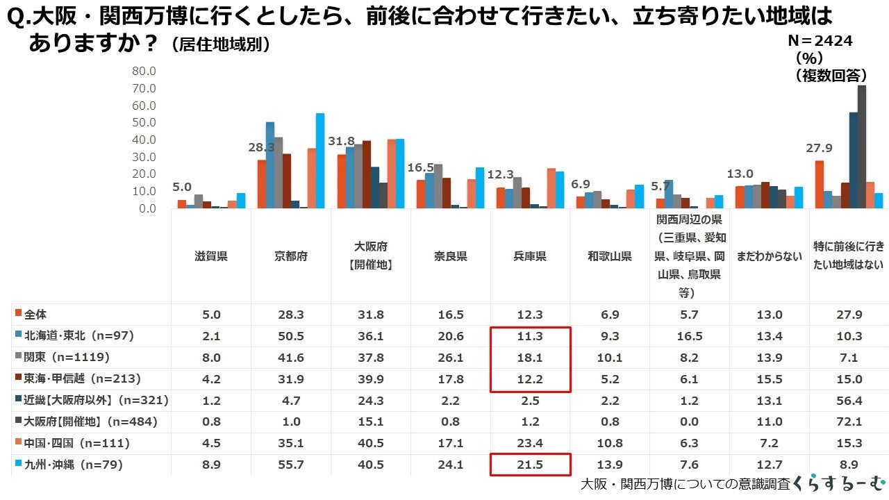 大阪・関西万博に行くとしたら、前後に合わせて行きたい、立ち寄りたい地域はあるか尋ねたところ、開催地である大阪府および隣接する京都府、奈良県が人気でした。兵庫県は大阪府に隣接していますが、北海道・東北、関東、東海・甲信越、九州・沖縄からでは奈良県よりも少ないという結果になりました。