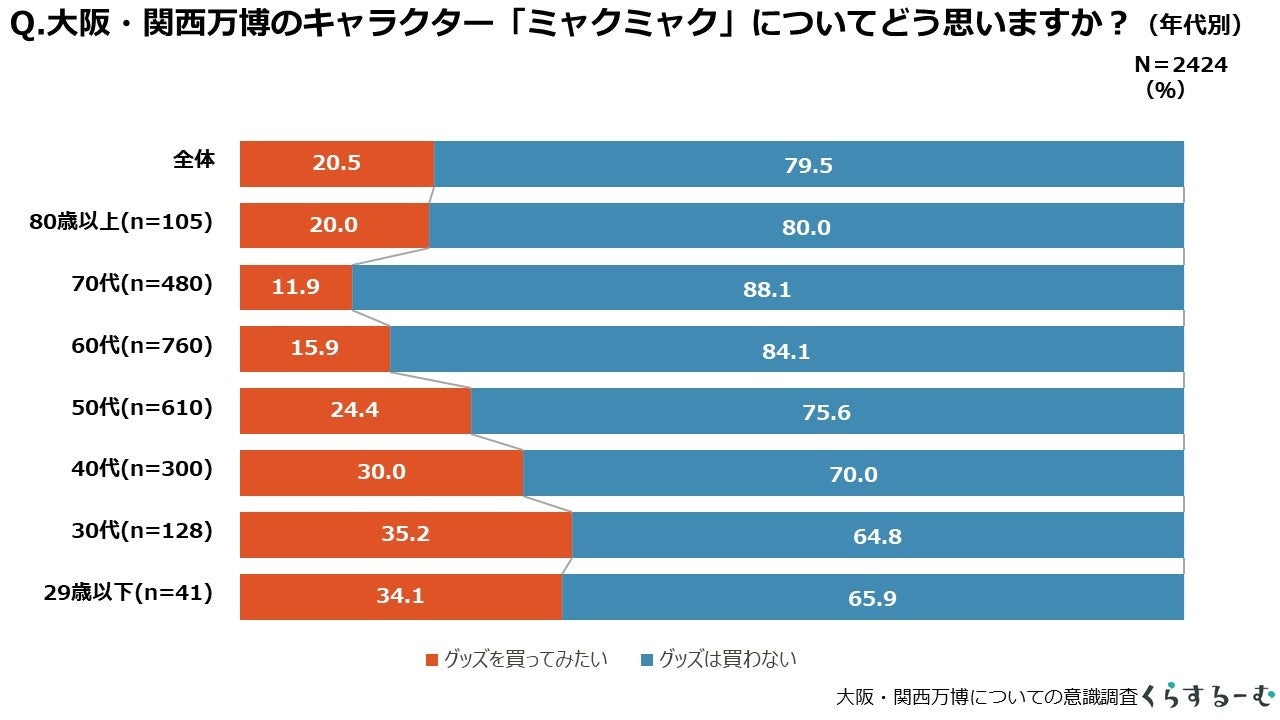 「ミャクミャク」のグッズを買ってみたいかについて尋ねたところ、「買ってみたい」と回答した人は全体として約2割、若い世代でも約3割となりました。男女別にみてみても男性では80.9%、女性は77.3%の方が「買わない」と回答しました。