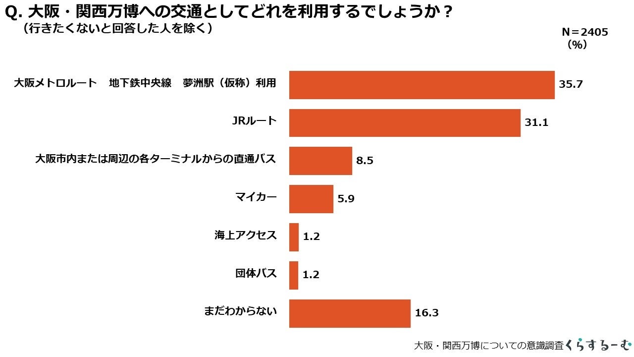 大阪・関西万博会場への交通ルートについて、主催者による来場者輸送基本方針にて想定されているルートに簡単な説明文も表示した上で、大阪入り後にどのルートを利用するか尋ねたところ、大阪メトロ(地下鉄)ルートとJRルートで行くという方が大半を占め、バスやマイカーの利用意向は少ない結果となりました。来場者輸送基本方針では鉄道利用の混雑緩和を重視しており、来場者をバスにも分散させる計画ですが、大阪メトロルートやJRルートに集中する恐れもありそうです。