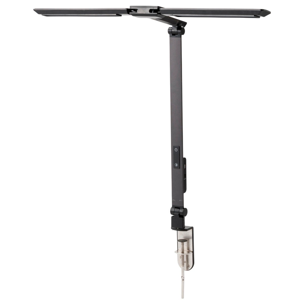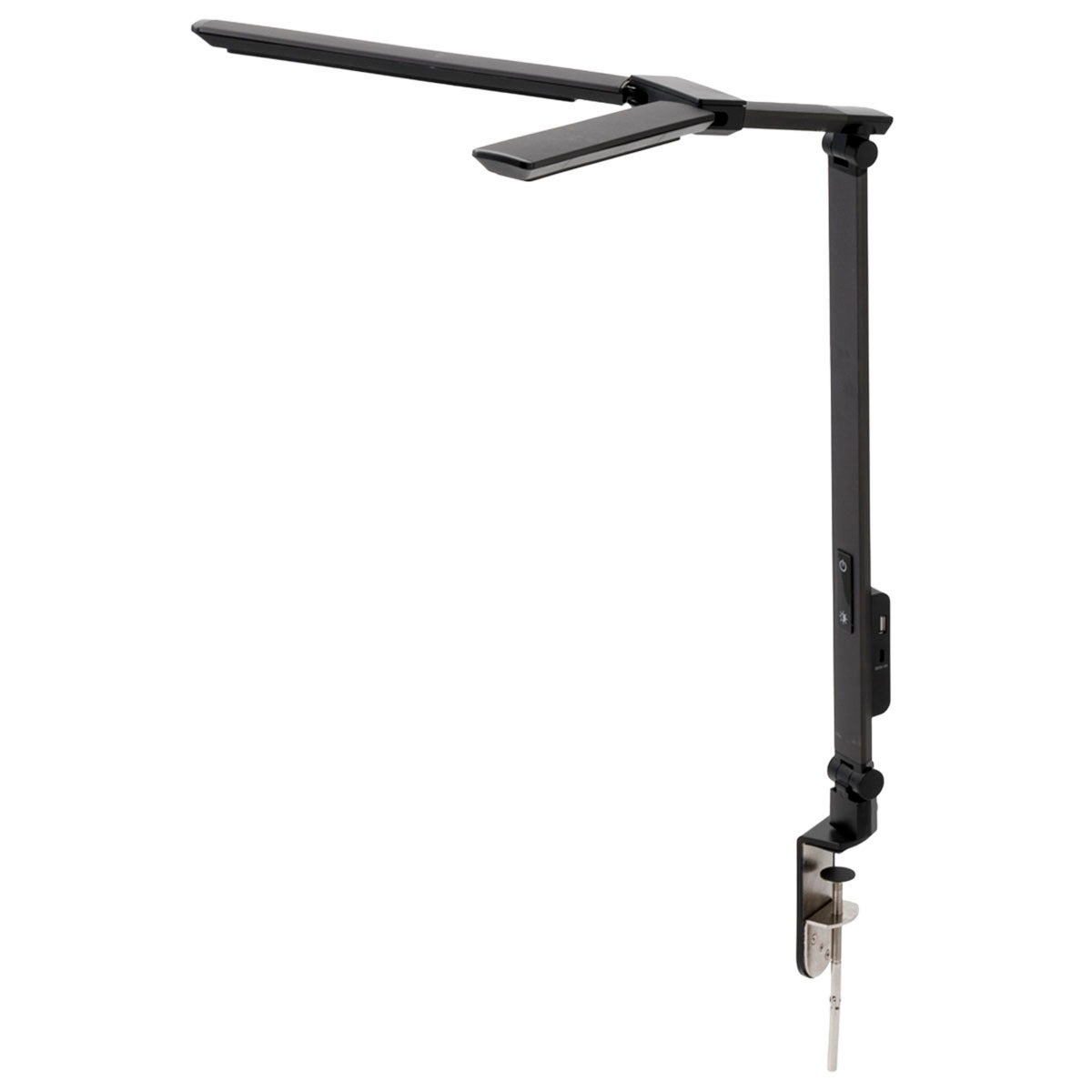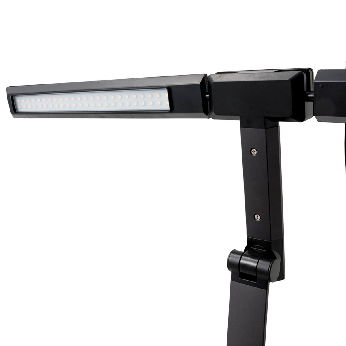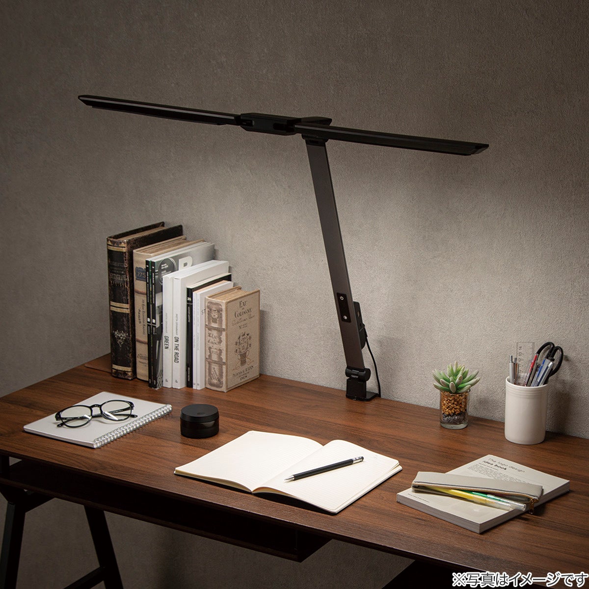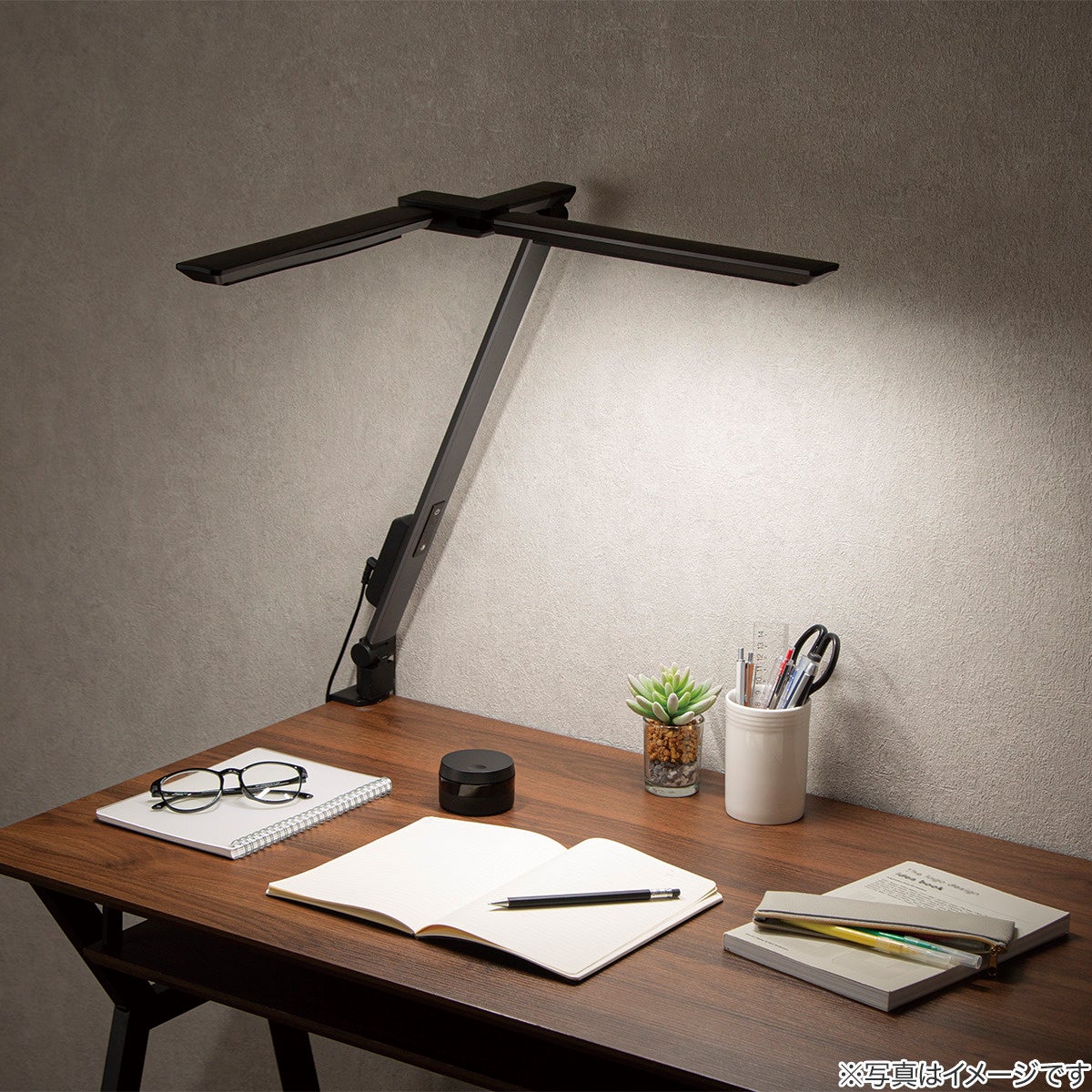クランプで固定するためスタンド不要で、デスクを広々使えます。アームは2か所が縦横に可動し、光の向きや角度をL字型に調整できるため、手元に影が生まれにくいのが特長。さらに、学習や読書に必要な明るさの目安を定めたJIS基準(JIS Z 9110)を満たす光量を実現。ライト直下では1,500ルクス以上の明るさを確保しながら、机全体でも平均500ルクスの均一な明るさを保つため、教科書・ノート・参考書を広げても、どこも見やすい環境が整います。使わないときはコンパクトに折りたためます。