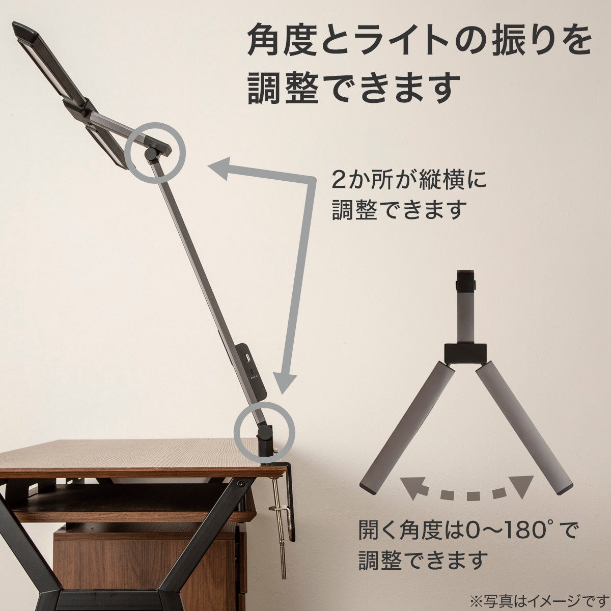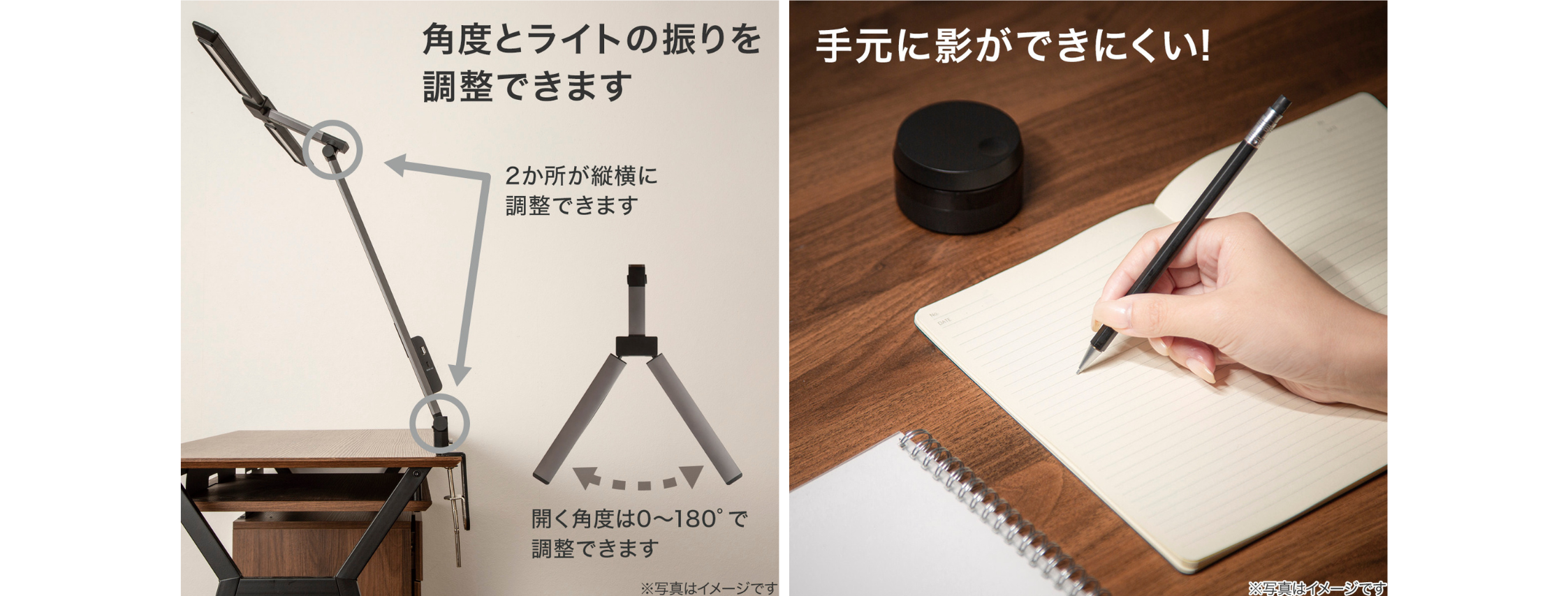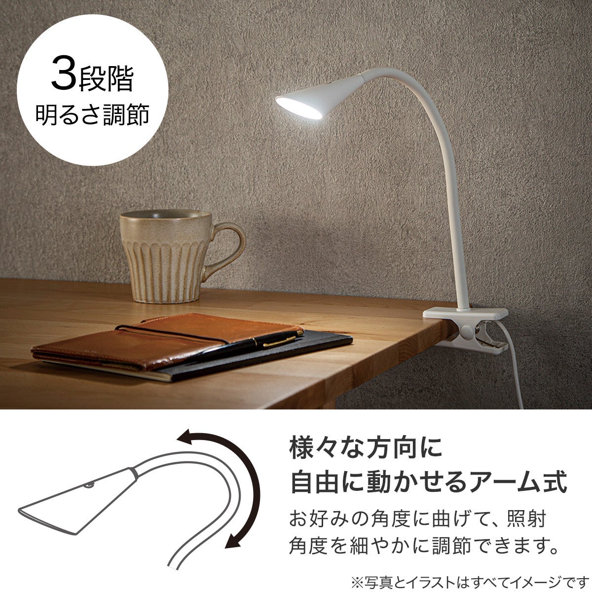 ③ デスクを広く使えるクランプ固定&手元に影ができにくい可動アーム設計