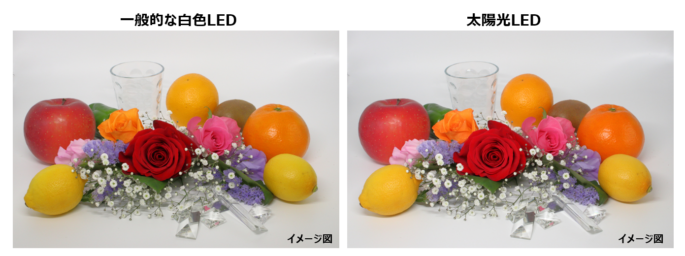 ※一般的な白色LEDと比較した場合、色の見えやすさを示す指標(演色性)においてより自然光に近い値を実現しています。