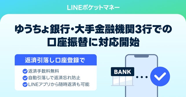 【LINEポケットマネー】登録可能な金融機関を拡充し、ゆうちょ銀行・大手金融機関3行からも口座振替による返済引落しが可能に