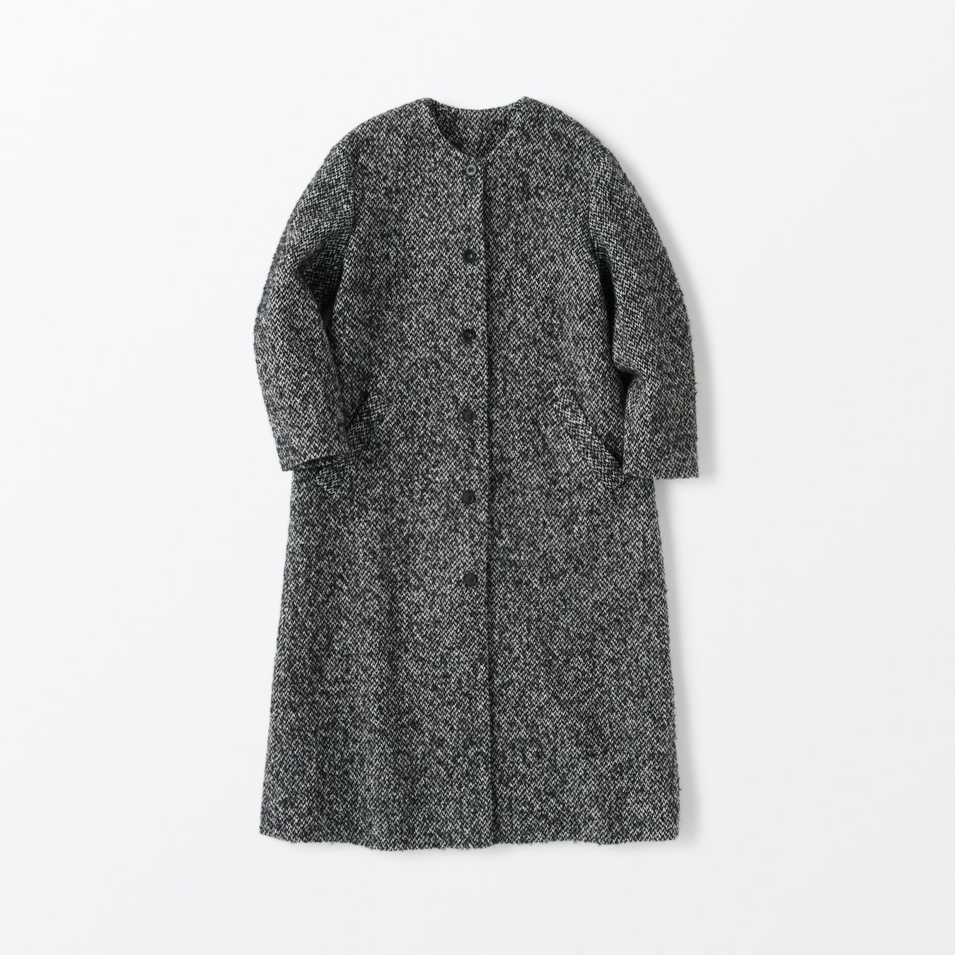フォーマルなシーンでも着用いただけるクラシカルなノーカラーのロングコート。
