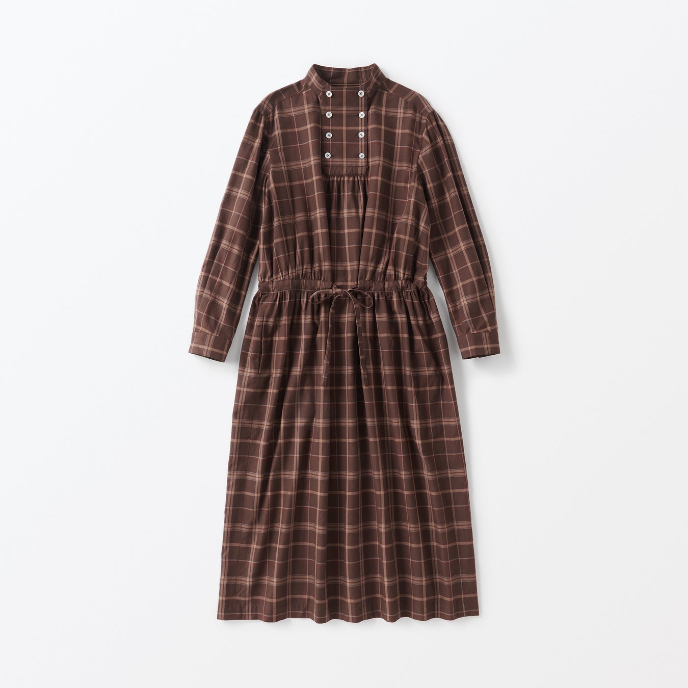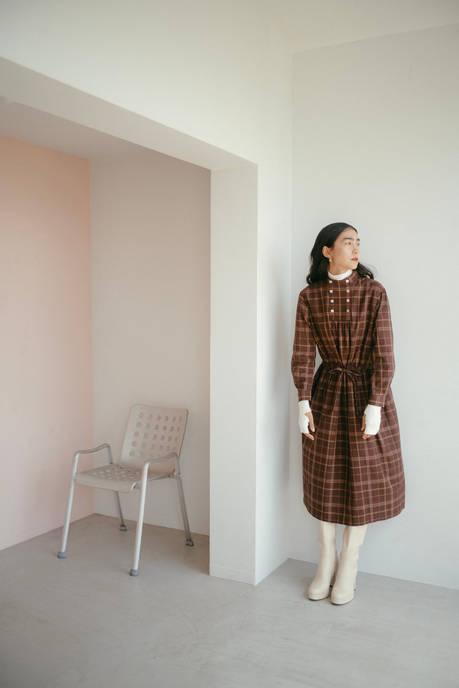 すこし高めに設定したウエスト部分から、ギャザーのスカートが広がります。胸元の8つの釦は白蝶貝で出来ており、光に当たると輝きます。上品な印象のチェック柄が甘すぎず、1枚でコーディネートが完成します。ミディアム丈のため、小柄な方へもおすすめの1着です。