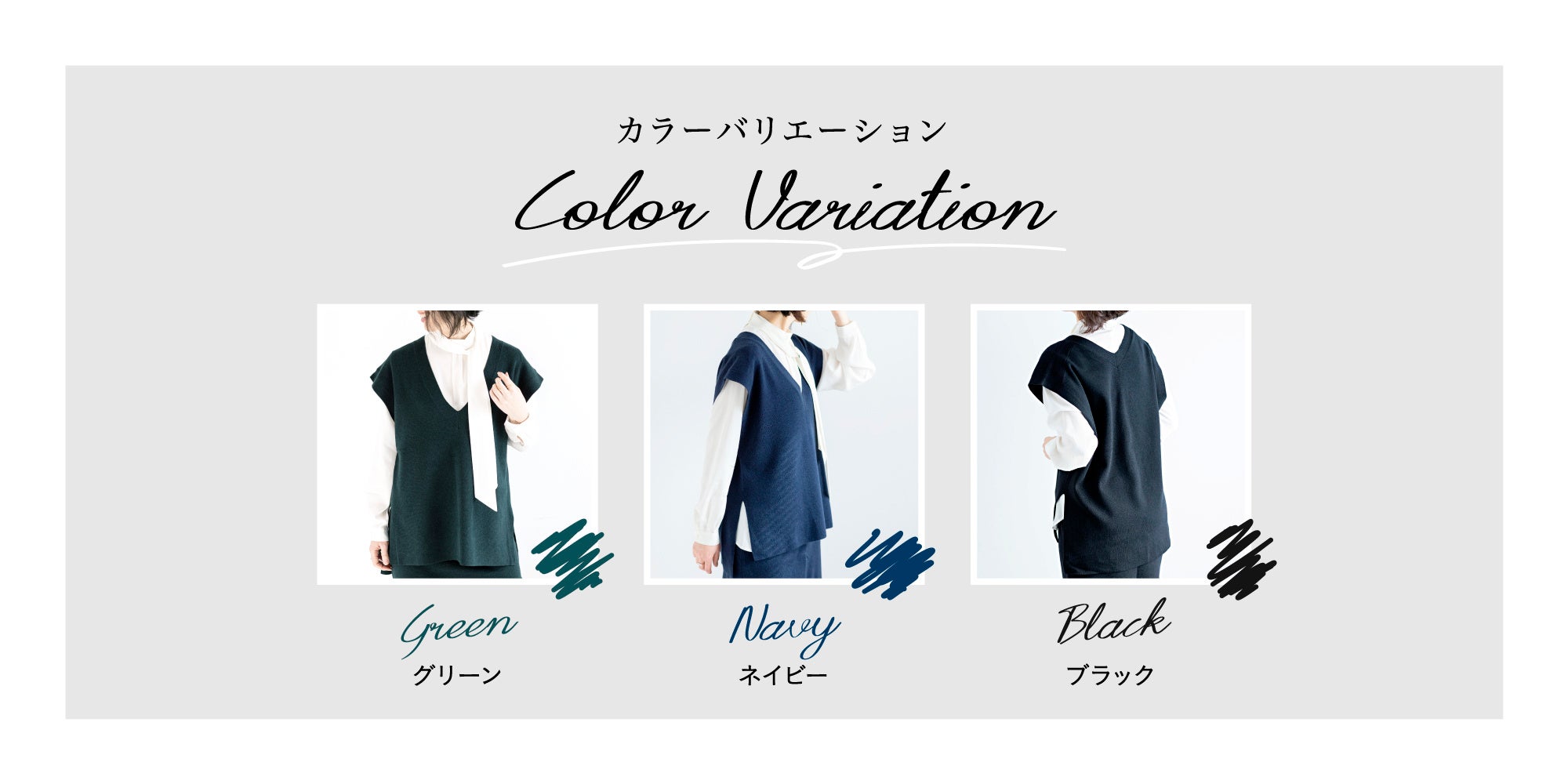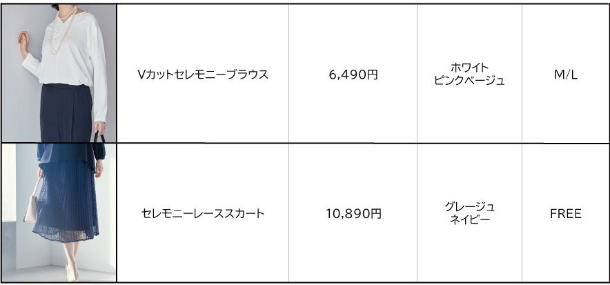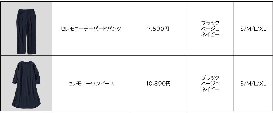 今回はマルチに使える6アイテムをラインナップ。顔周りをスッキリ見せるノーカラージャケット(税込¥10,890)、ふんわり裾が広がり上品な印象を与えるフレアブラウス(税込¥6,490)、首元を上品に程よい抜け感を演出するVカットブラウス(税込¥6,490)、どんなトップスにも合わせやすいテーパードパンツ(税込¥7,590)、コーディネートに華を添えるレーススカート(税込¥10,890)、1枚でコーディネートが完成するワンピース(税込¥10,890)とお手頃価格で、お好みに合わせ全身コーディネートがそろいます。また、サイズ展開もS~XLと豊富で(レーススカート・Vカットブラウスを除く)、ブラック・ベージュ・ネイビーを中心に、シーンに合わせて選びやすいベーシックカラーで展開します。