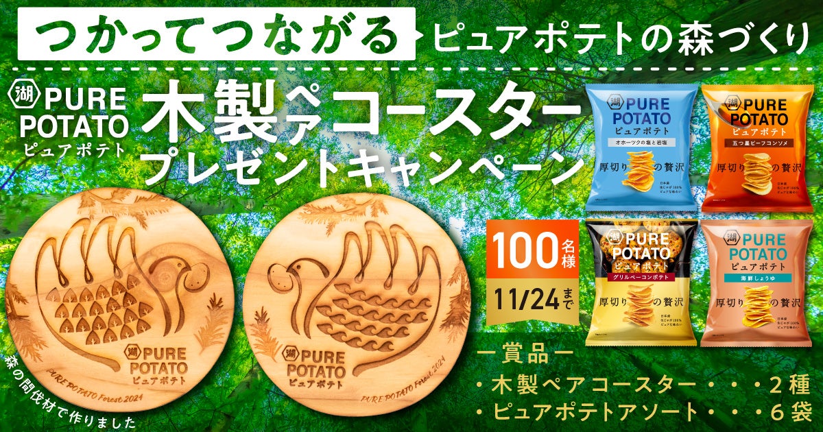 今回のキャンペーンは、「ピュアポテトの森」に対する湖池屋の想いや背景をまとめたweb記事をお読みいただき、こちらの記事をシェアしていただくことで、ご応募できる形式となっています。記事を通して「ピュアポテトの森」のことをより深く知っていただいた上で、森から生まれたオリジナル木製コースターと、ピュアポテト各種が当たるキャンペーンにぜひご応募ください。