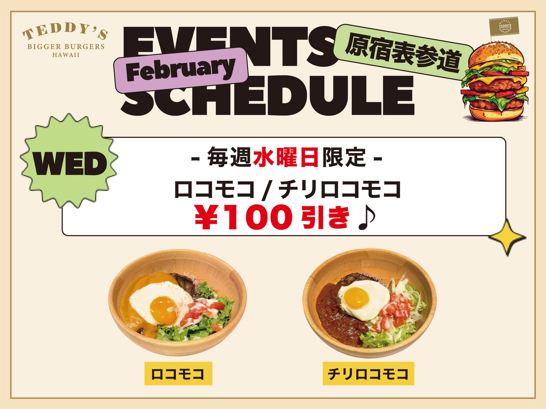 24年連続ハワイベストバーガー賞受賞の「テディーズビガーバーガー」原宿表参道店限定で、2月の毎週水曜日に、「ロコモコ」と「チリロコモコ」を通常価格から100円引きでお楽しみいただけるスペシャルキャンペーンを実施します!
