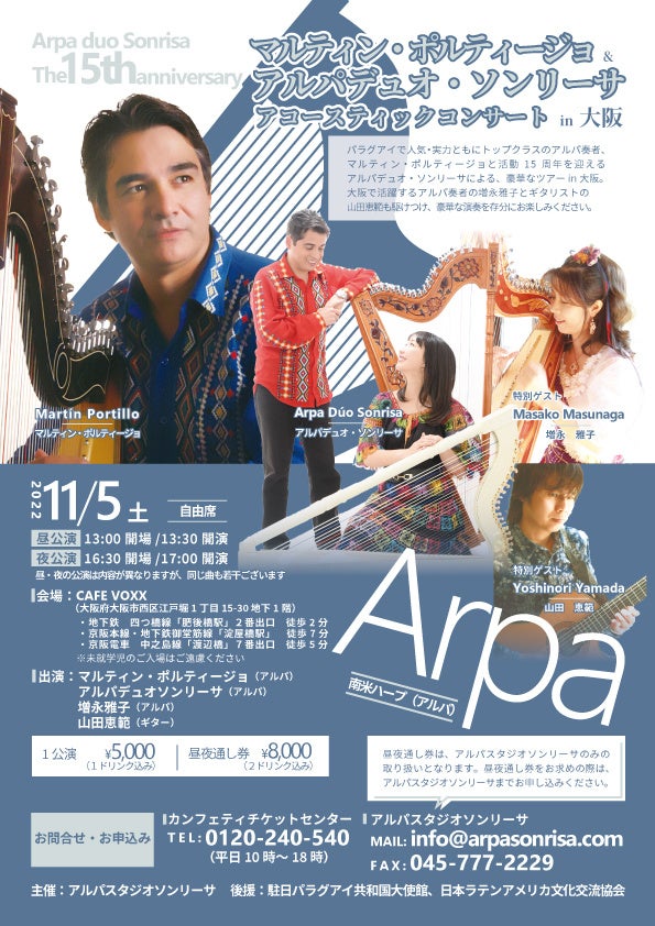 アルパデュオソンリーサの活動15周年を祝し、アルパの本場パラグアイから名実ともにトップクラスの奏者を招待し、コンサートを開催します。