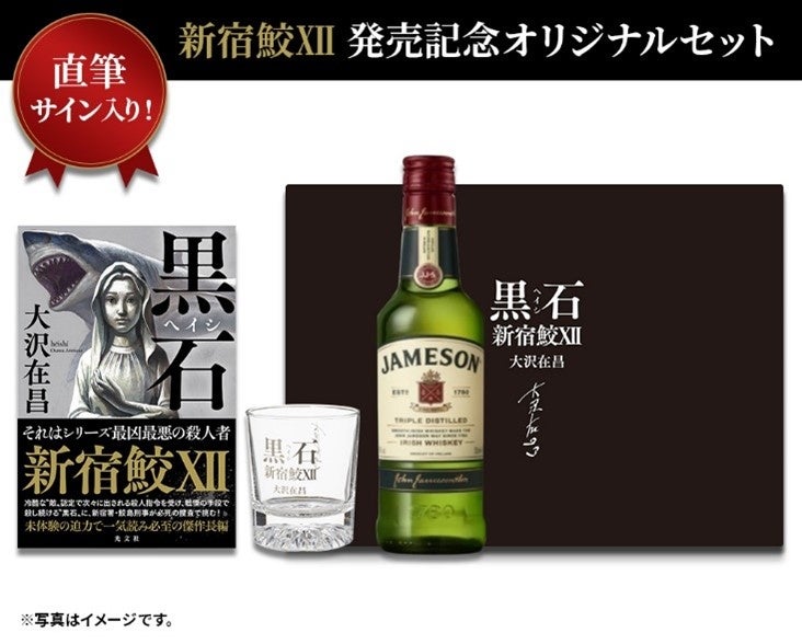 またこのイベントでは、今回でしか購入できない発売記念オリジナルセット(直筆サイン本+オリジナルウイスキーグラス+JAMESON350㎖1本)を発売中。"鮫島刑事の愛飲ウイスキー"と、大沢在昌氏サイン入りオリジナルグラスが一緒になった記念セットです。当日は大沢氏がマスターとしてグラス片手に登場します。