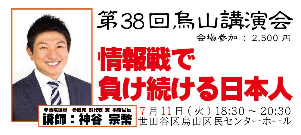 同講演会ではこれまで、ジャーナリストの櫻井よしこ氏や米カリフォルニア州弁護士のケント・ギルバート氏など多彩な言論人が登壇し、内外の情勢を鋭く分析する講演を行ってきました。今回は、参政党副代表の神谷宗幣参院議員を講師に迎え、「情報戦で負け続ける日本人」をテーマに日本が克服すべき課題について考えます。