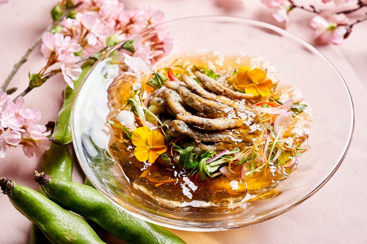 春の味覚である筍や山菜をはじめ、海老や鰹、鯛など色味も春らしさを感じる山海の食材を中心に、出汁やソースには九条ネギや抹茶など京都らしさを添えて、季節の彩りが豊かなシェフ自慢のバリエーションに富んだメニューを多数ご用意します。また、土日祝のディナータイムには、焼きたてのアップルパイをお席までワゴンサービスにてご提供します。