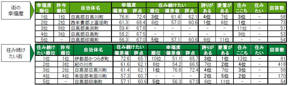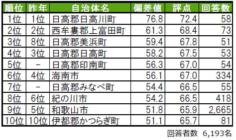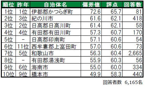 伊都郡かつらぎ町が、唯一偏差値70台の高い評価を得て2年連続で1位に輝きました。2位は昨年3位から一つ順位を上げた紀の川市、3位は日高郡日高川町です。その他トップ10内では、5位に初登場の日高郡印南町(昨年は累計回答者数が50名未満でランキングの集計対象外)、8位に有田郡湯浅町(昨年は偏差値50未満のため順位非公開)がランクインしています。