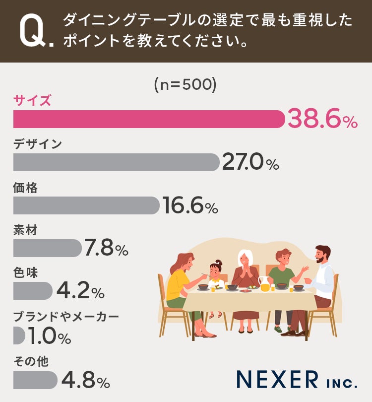 ■ダイニングテーブルの選定で最も重視したポイント、38.6%が「サイズ」
