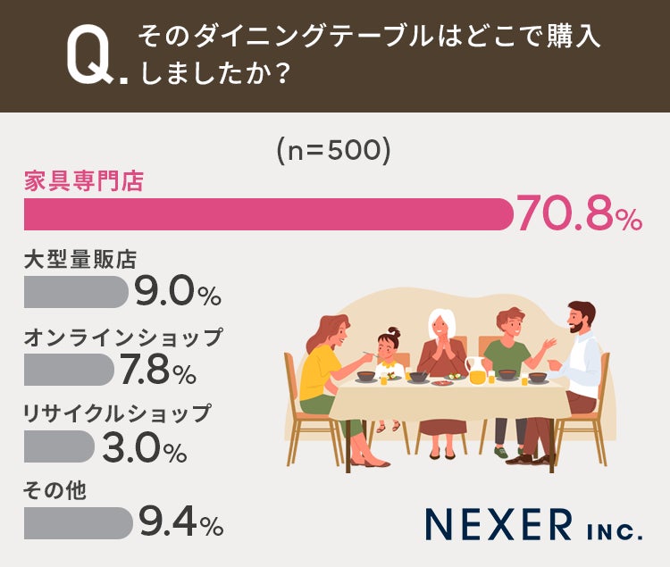 【ダイニングテーブル使ってますか?】使用者の70.8%が「家具専門店で購入」