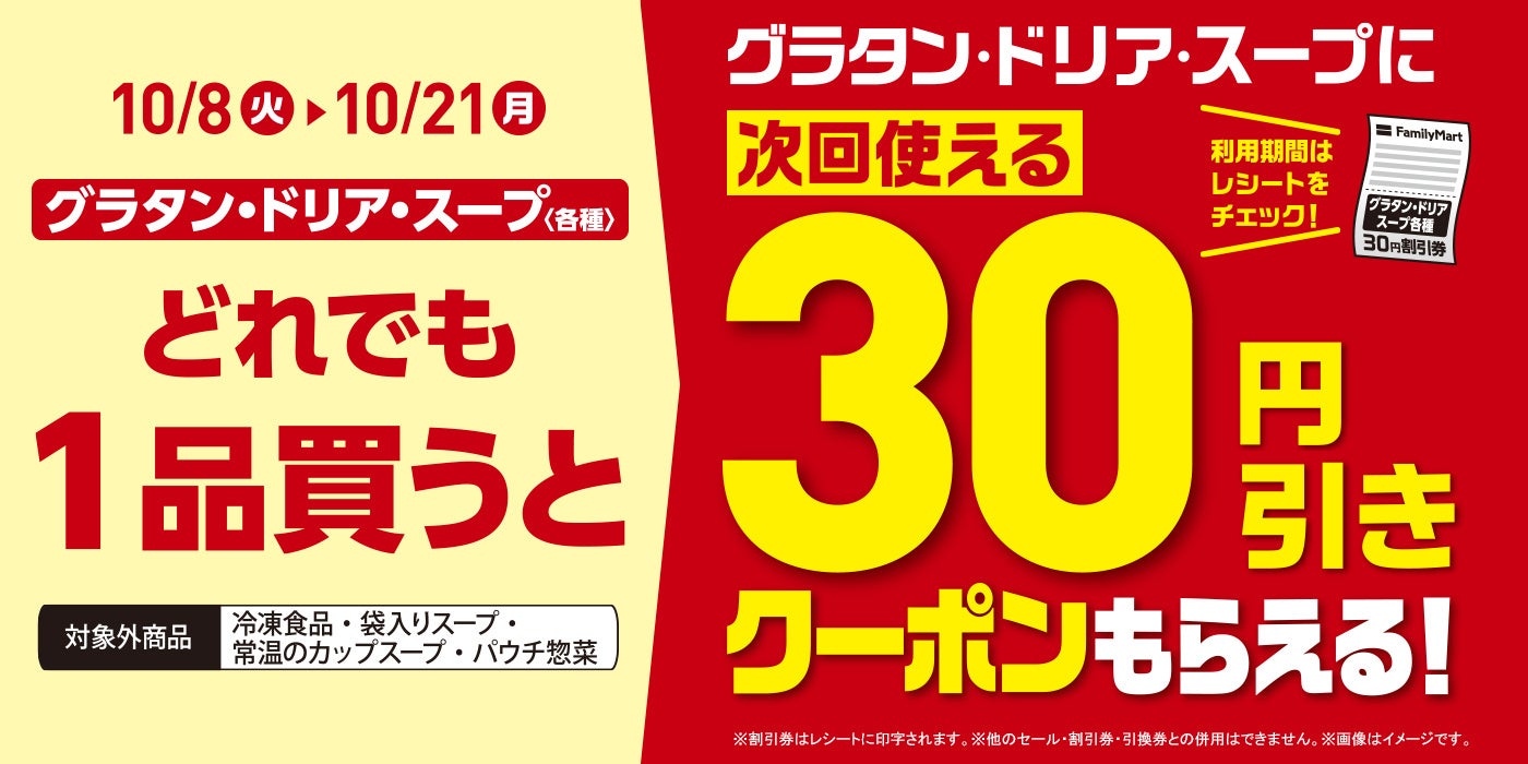 グラタン・ドリア・スープをご購入いただいたお客さまに、次回グラタン・ドリア・スープで使える30円引きの割引クーポンがもらえるキャンペーンを実施いたします。