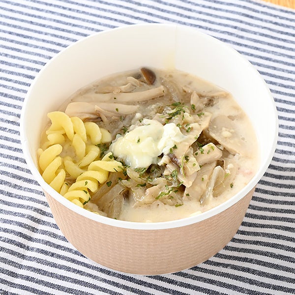 【内容】きのこペーストや生クリームを加えた、クリーミーで濃厚な味わいが楽しめるきのこのクリームスープです。トリュフオイルで和えたしめじ、炒めて香りを出したエリンギと舞茸、ベーコン、チーズ、ショートパスタが入っています。