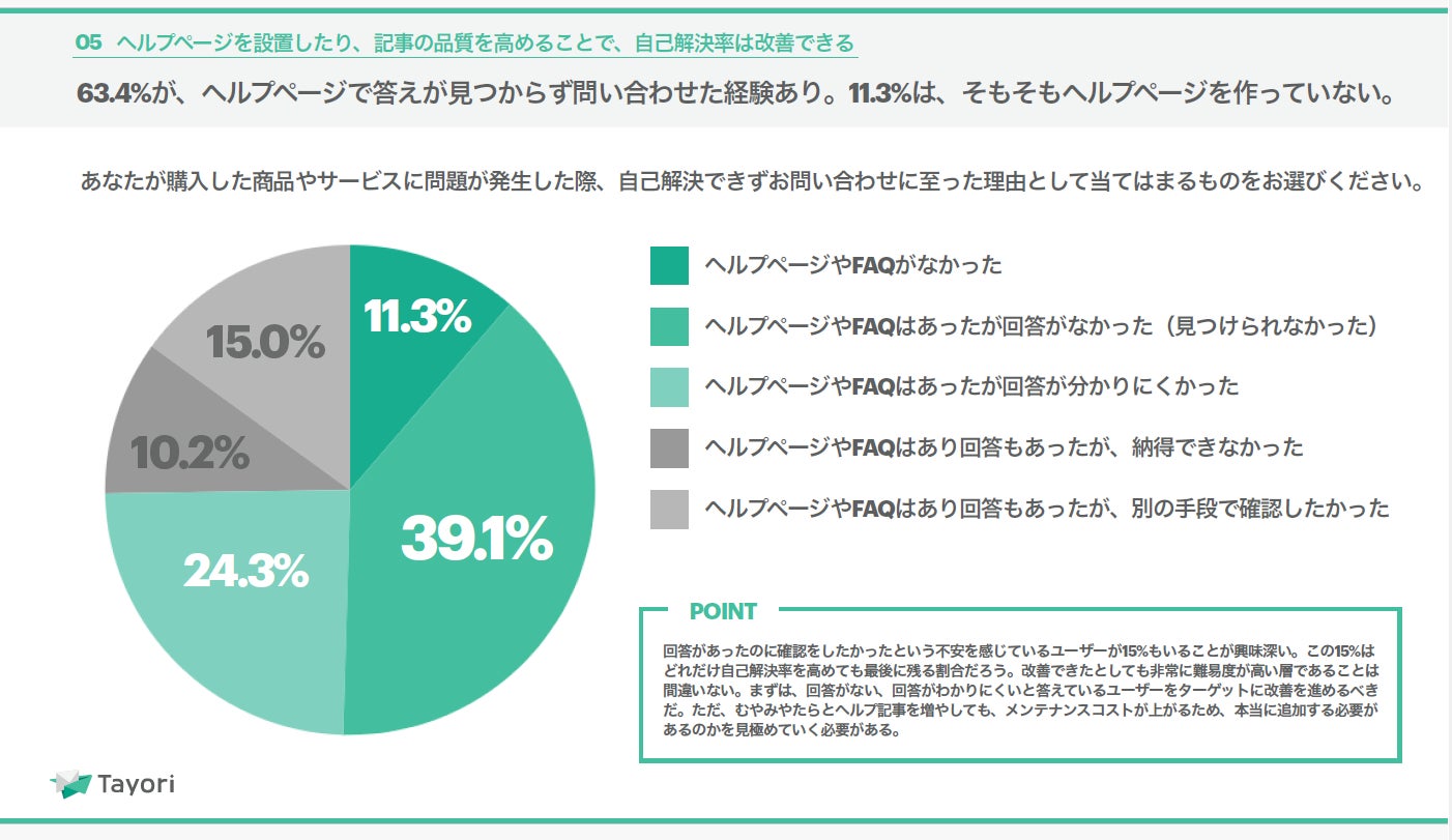 FAQは多くの企業に利用されていますが、お客様視点で見たときにその問題を解決しきれていません。「カスタマーサポート白書2024」では、FAQを閲覧後もお問い合わせに至った原因として「ヘルプページやFAQはあったが回答が見つけられなかった/回答がわかりにくかった」という回答が63.4%となっており、お客様の自己解決を促すFAQがうまく機能していない現状が明らかになっています。その理由としては、FAQの内容がよくある質問になっていないことや、質問の記載がわかりづらい、改善運用できておらず中身が古いことが挙げられます。