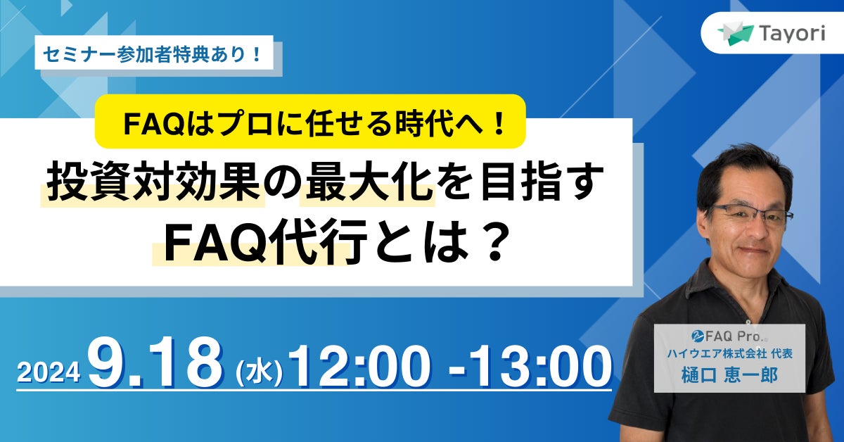 成果を出すFAQ代行プランについて、パートナーである樋口氏と一緒に解説をいたします。当日は、FAQ改善や費用対効果におけるお悩みをどう解決するのか。代行を依頼した際には、どのように課題を解決し成果を出すFAQを作っていくのかのご説明いたします。当日ご参加された方には、特典もございますので是非ご参加ください。