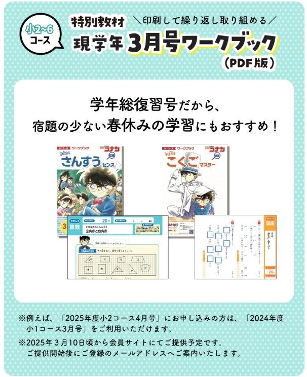 「春の入会キャンペーン」は2025年2月21日(金)から3月31日(月)まで。期間中のご入会で、通信教育(教材配送)2025年度4月号会費が2,000円割引になるほか、現学年の総復習ができる3月号ワークブック(PDF版)や名探偵コナンゼミオリジナルのワークブックカバーなどの豪華特典が付いた大変お得なキャンペーンです。
