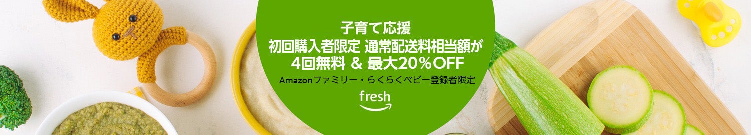 Amazonファミリー・らくらくベビーご登録者の方で、Amazonフレッシュ※1にて初めてお買い物をされる方には、期間中最大4回まで使える通常配送料相当額のクーポンを進呈します。