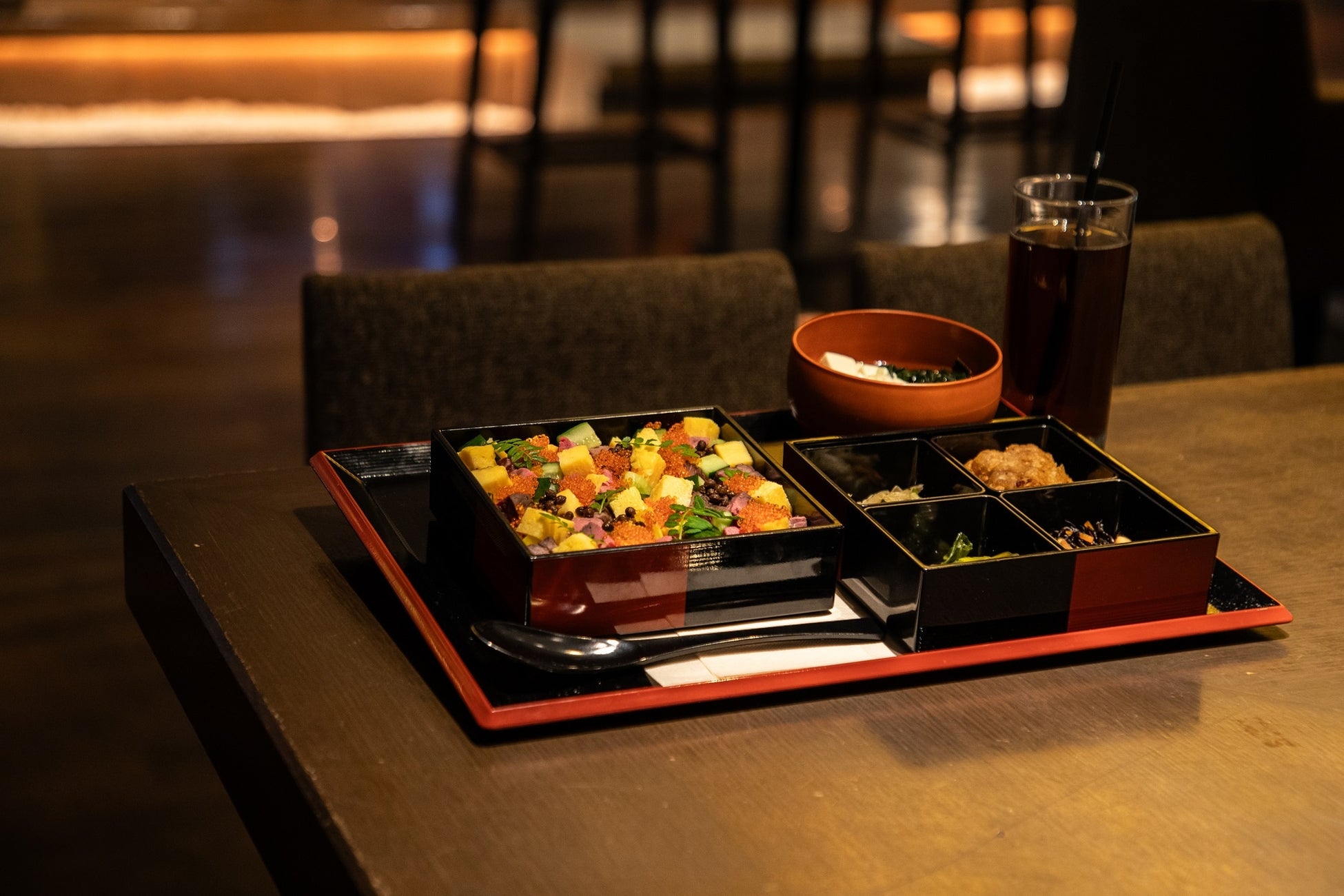毎月シーズナルな料理を提供するランチマンスリーメニュー。3月限定ランチに「蔵王牛のローストビーフちらし重」がお目見え。黒毛和牛の脂の旨さと、野性味溢れる赤身肉の旨さを合わせ持つ蔵王牛をローストビーフに仕立て、とびこや玉子、胡瓜とともにぎっしり詰め込んだ見た目も華やかな特製ちらし寿司です。ちらし寿司の上段には「鶏のから揚げ」「ひじきの煮物」「小松菜のお浸し」「香の物」などヘルシーな和のおかずを詰めました。門出を祝う機会が多いこの時期に、大切な方とぜひ豪華絢爛ちらし重をお愉しみください。