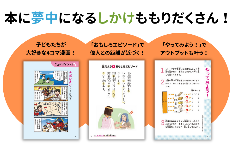 各話の最初には、子どもたちが大好きな4コマ漫画による人物紹介や、偉人との距離が近づく「おもしろエピソード」を収録しました。また、伝記を読み終えたあとの「やってみよう!」コーナーでは、読後すぐにアウトプットをすることで思考力を伸ばします。