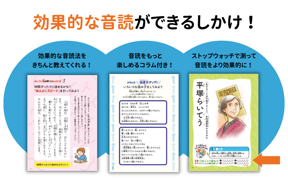 より効果的な音読を実践できるよう、「強調おんどく」「読み分けおんどく」の実践方法や、ストップウォッチを使った音読の実践方法など、どんなことを意識して読むと効果的なのか?を詳しく説明しました。さらに、音読そのものを楽しみながら、各学年で伸ばしたい力(4年生は〈伝える力〉、5年生は〈わかる力&吸収する力〉、6年生は〈気持ちを知る力&考える力〉)を鍛える、楽しいコラムページ付きです。