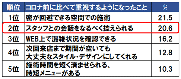 ■コロナ前に比べて美容サロンで「スタッフとの会話をなるべく控えられる」を重要視する人が約2割