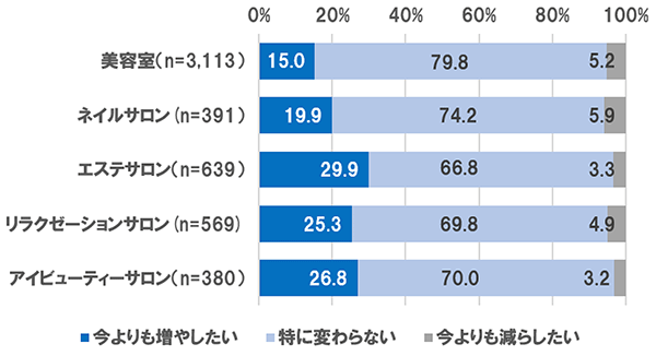 「今よりも増やしたい」が最も高いのは「エステサロン」、次いで「アイビューティーサロン」。