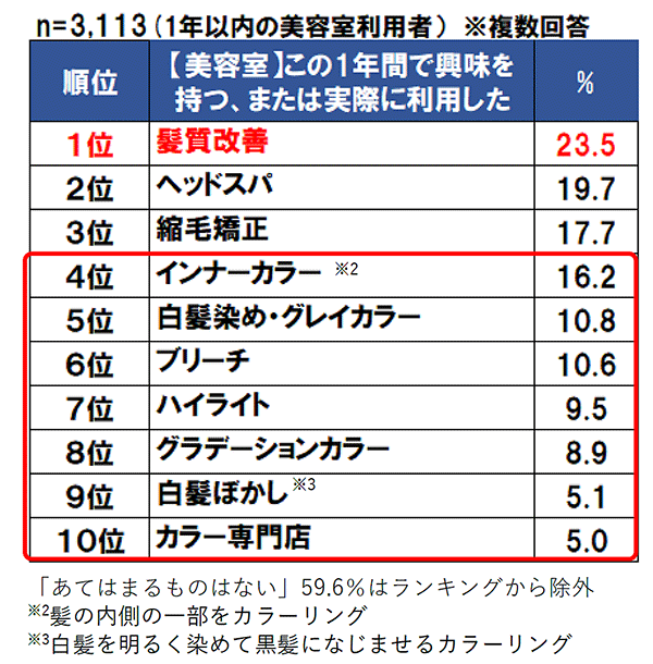 美容室メニューランキングで「髪質改善」が1位になった背景には、カラーによって傷んだ髪をしっかりケアしたいというニーズの高まりがあります。カラー人気は若年層だけではなく、30代、40代のオトナ女性にも。コロナ禍で在宅ワークが増えたことで「インナーカラー」などのハイトーンカラーにチャレンジするオトナ女性が増えています。白髪染めにも「白髪ぼかし」でハイトーンカラーを使うなど多様化しています。