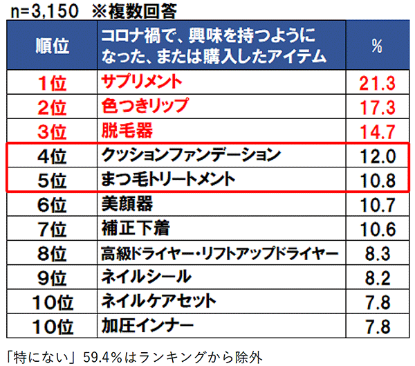 美容アイテムランキングでは、4位、5位の「クッションファンデーション」「まつ毛トリートメント」は美容サロンの店販でもコロナ禍で売り上げが増えた商品。サロンの役割はサロンでの施術から、自宅ケアにも広がっています。
