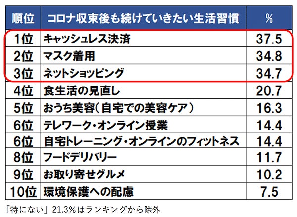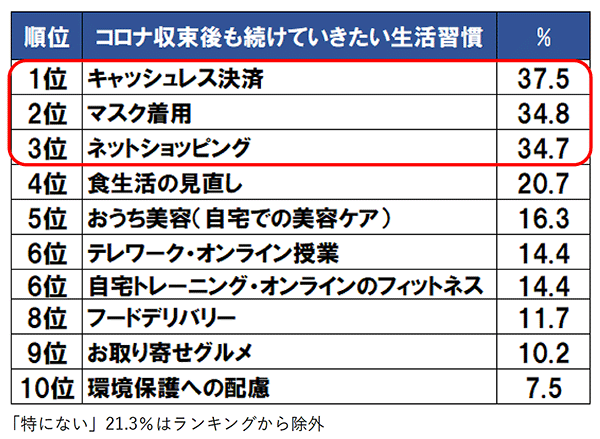 1位「キャッシュレス決済」、2位「マスク着用」、3位「ネットショッピング」と続く。
