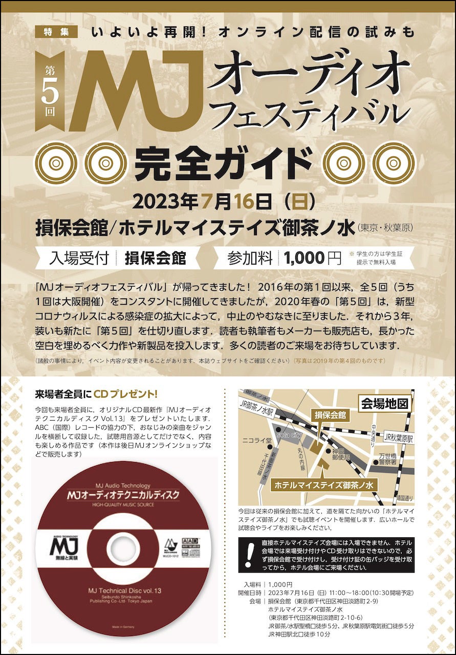 月刊誌『MJ無線と実験』(毎月10日発売)では、恒例の『MJオーディオフェスティバル』を令和5年7月16日(日)に、秋葉原・損保会館をメイン会場として開催します。