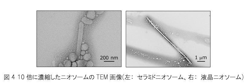 「セラミドニオソーム」は濃縮した後においても、ナノサイズの球状または棒状の構造を維持しているのに対し、「液晶ニオソーム」は巨大な繊維状の構造に変化していることが明らかになりました(図4)。