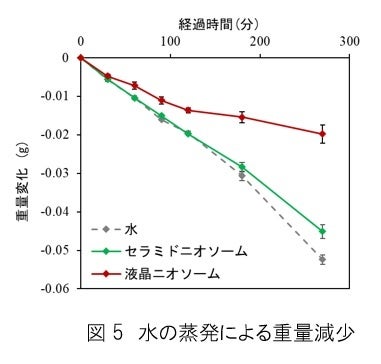 メンブレンフィルター(5)を用いた水分透過試験で、「液晶ニオソーム」処理が水分の蒸発を顕著に抑制。液晶ニオソームの巨大な繊維状構造への変化が保湿性の維持や、肌のバリア機能の向上に寄与する可能性が示されました。