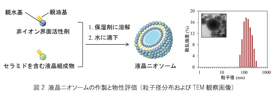 そこで、本研究ではセラミドを他の成分と併せて液晶組成物(結晶性が低い状態)とし、それをニオソームと組み合わせることで、セラミドの保湿効果をより発揮できる、柔軟性の高い「液晶ニオソーム」の開発を目指しました。
