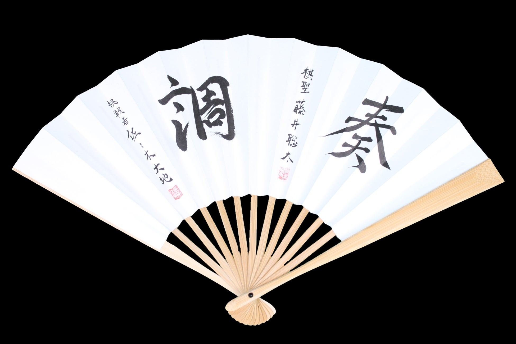 扇子は長さ約25.5cm、広げたときの横幅約41.5cmで、棋士が使用しているものと同じタイプ。右から順に藤井棋聖の「奏」、佐々木七段の「調」の揮毫が入っています。日本将棋連盟の謹製。8月上旬以降に発送予定です。※受注生産のため、遅れる場合があります。