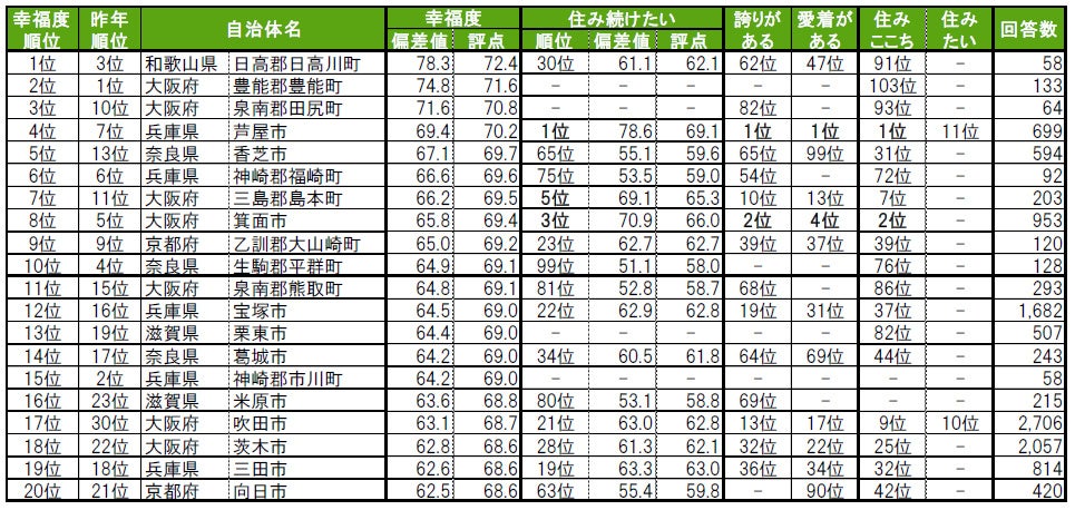 ■街の幸福度(自治体)トップは、初の1位となった和歌山県日高郡日高川町(ひだかがわちょう)