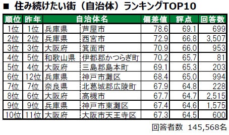 1位は3年連続で兵庫県芦屋市で、「住みここち(自治体)」でも1位となっている街です。2位も3年連続で、兵庫県西宮市です。3位は2年連続で大阪府箕面市で、「住みここち(自治体)」で2位の評価を得ている街です。