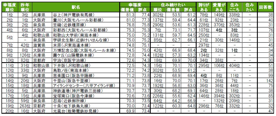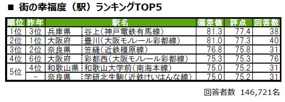 1位は神戸市北区に位置する谷上で、昨年3位から順位を上げました。2位は茨木市に位置する豊川で、トップ2は偏差値80台の極めて高い評価を得ています。3位は、磯城郡田原本町に位置する笠縫です。その他トップ10内で初登場の駅は、5位タイでランクインした奈良県学研北生駒で、昨年は累計回答者数が30名未満でランキングの集計対象外でした。