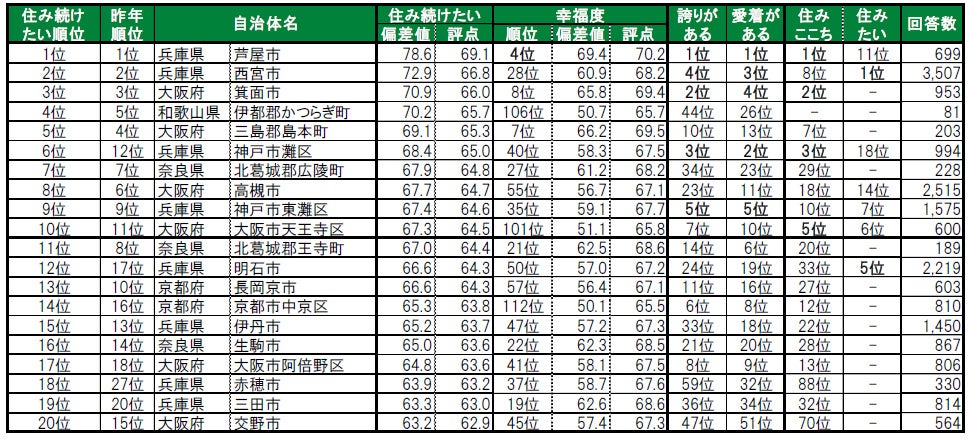 ※住み続けたい街・街に誇りがある・街に愛着があるの順位が「-」と表示されているのは、偏差値50未満のため「-」と表示しています。