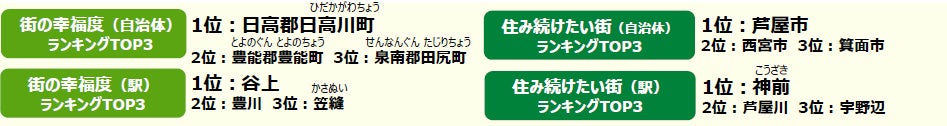 街の幸福度ランキングは、 「全体としてみて、あなたは現在、幸せですか、あるいは不幸せですか」に対して、 1点(非常に不幸)から10点(非常に幸福)までの10段階で評価してもらい、その回答の平均値を10倍して、100点満点に換算。住み続けたい街ランキングは、「今住んでいる街に、ずっと住んでいたいと思う」に対して、 「そう思う」:100点から「そう思わない」:0点までの5段階評価をしてもらい、その回答の平均値で作成。「誇りがある」「愛着がある」も「住み続けたい街ランキング」と同様の方法で作成。